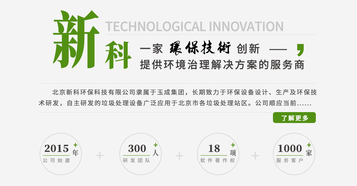 北京新科環(huán)保科技有限公司隸屬于玉成集團(tuán),是一家專業(yè)提供垃圾綜合治理全產(chǎn)業(yè)鏈服務(wù)的環(huán)保企業(yè)。長(zhǎng)期致力于環(huán)保設(shè)備設(shè)計(jì)、生產(chǎn)及環(huán)保技術(shù)研發(fā),自主研發(fā)的垃圾處理設(shè)備廣泛應(yīng)用于北京市各垃圾處理站區(qū)。