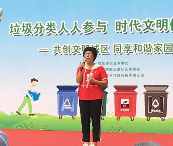 活動中,觀音寺街道辦事處主任張保敬發(fā)表了熱情洋溢的致辭。她號召大家行動起來,培養(yǎng)垃圾分類的好習慣,帶動社區(qū)人人動手,一起為改善生活環(huán)境做努力。首座御園三里社區(qū)居委會書記,新科環(huán)??萍加邢薰究偨?jīng)理姬理迪以及首座御園三里試點會員等先后上臺進行發(fā)言,各自表述了自己眼中的垃圾分類和對環(huán)保的關(guān)心與熱愛,并且對垃圾分類工作開展做出了計劃和目標。