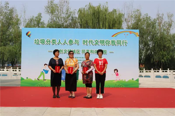在欣賞孩子們優(yōu)美舞姿之后,觀音寺街道辦事處張保敬主任為垃圾分類示范家庭頒發(fā)榮譽證書,新科環(huán)??萍加邢薰究偨?jīng)理為回收試點積分前三名發(fā)放獎品。