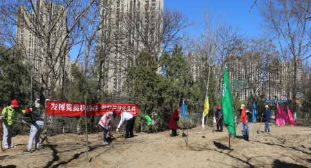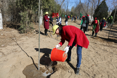 在植樹活動現場,大家熱情高漲、積極配合,有的揮鍬鏟土,有的鏟土填坑,有的夯實土層,還有的澆水灌溉,整個現場處處都是大家忙碌的身影。經過一個多小時的勞動,50余棵小樹在這里“安家落戶”,為這里添上了一份新綠。
